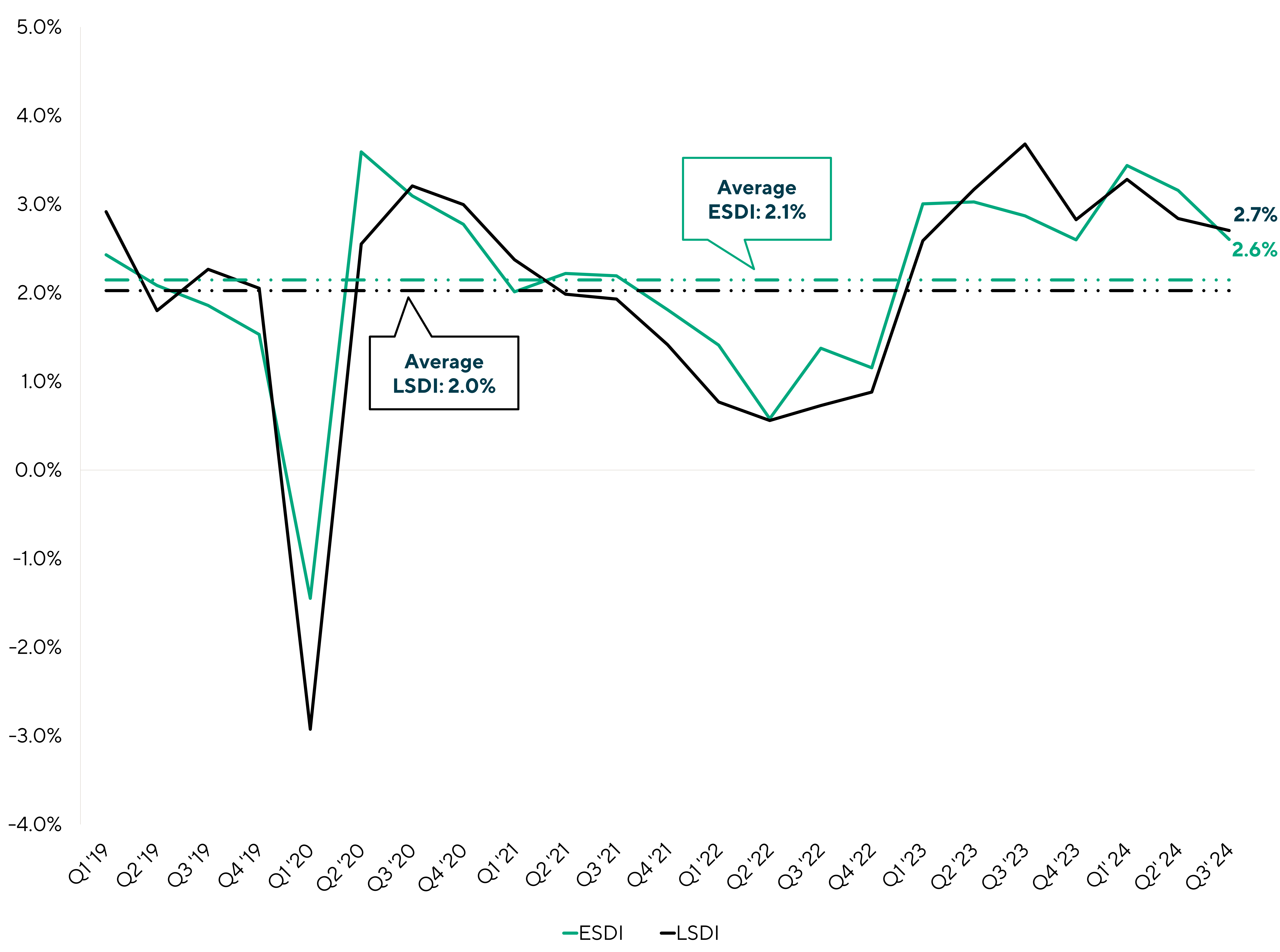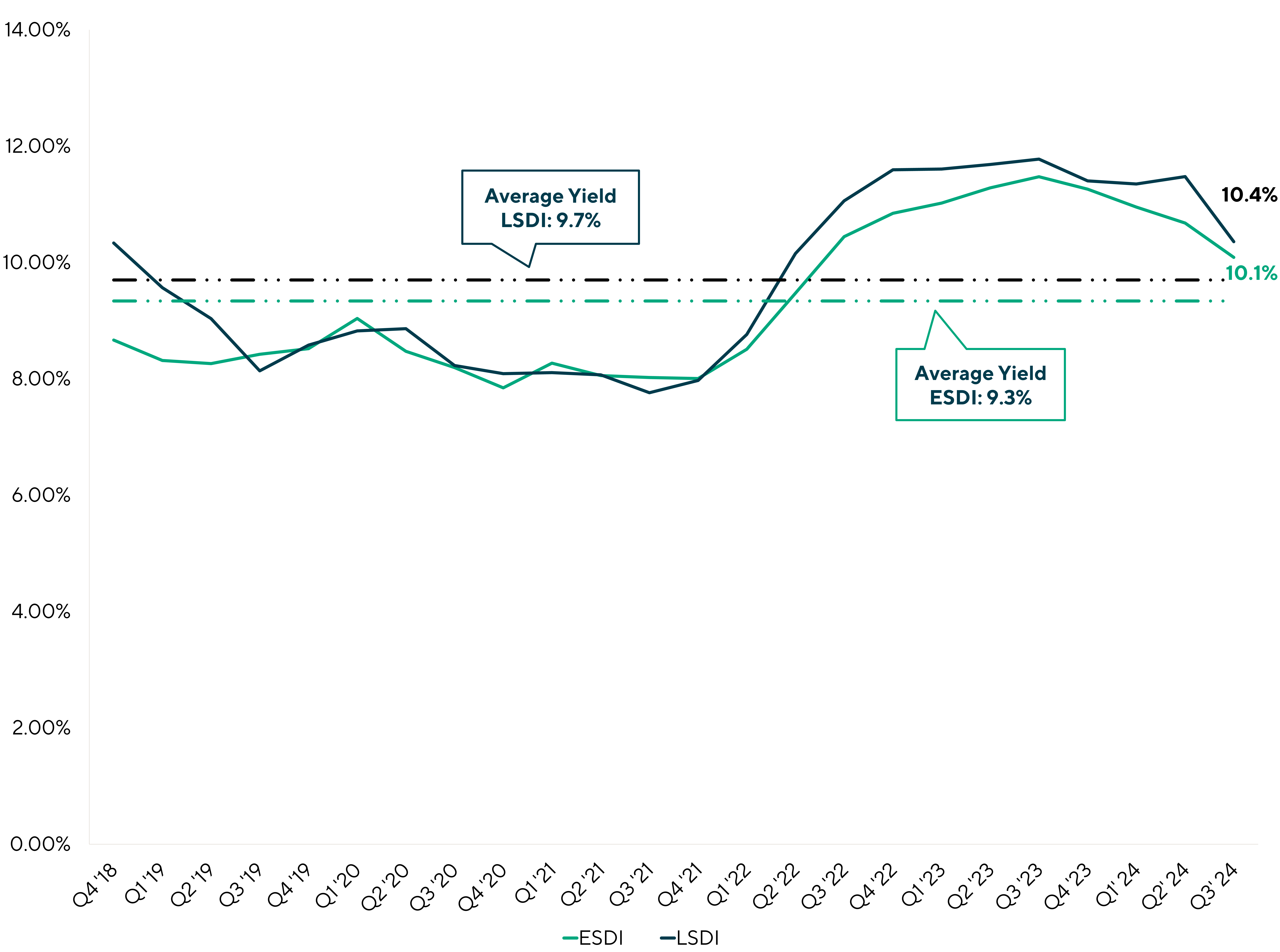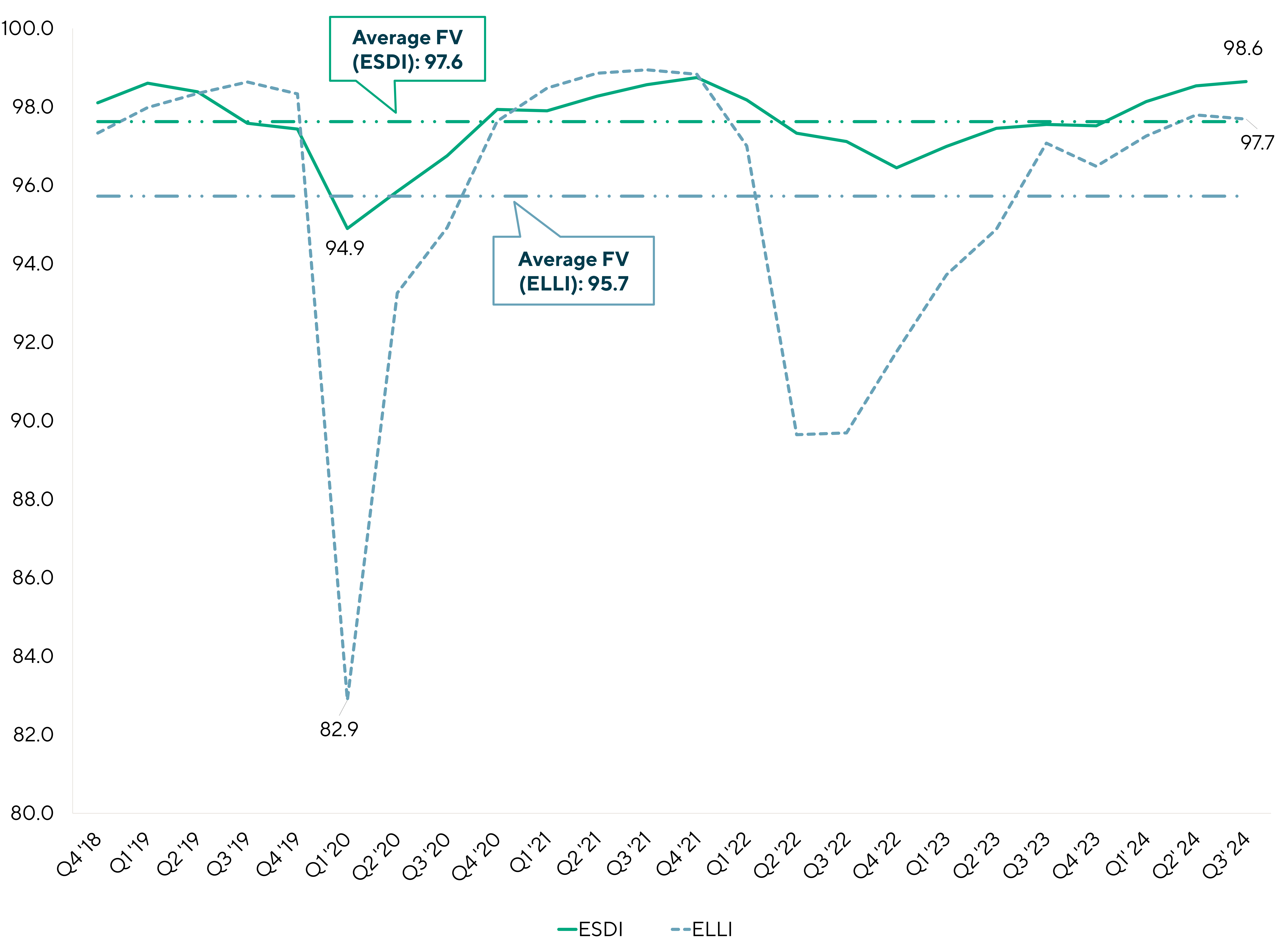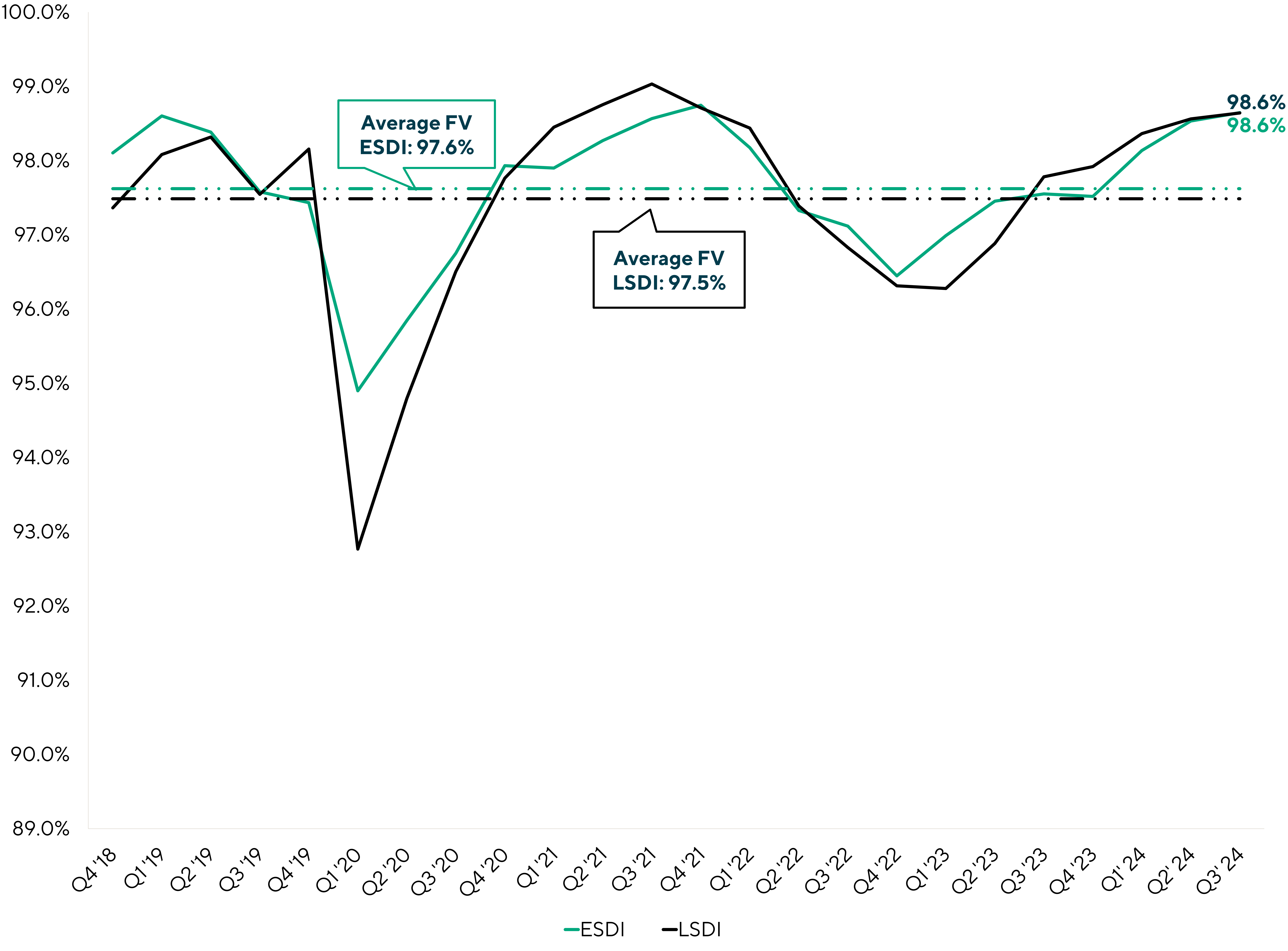 The results of the ESDI were no surprise as they continued to showcase the same trends and observations seen in Q2 2024. The ESDI yielded 10.1%, reflecting a marginal decrease in yield relative to the prior quarter as base rates started to decrease. Similarly, the third quarter of the year finished with a fair value of 98.6 for the ESDI, a modest improvement relative to the 98.5 fair value from the previous quarter.
