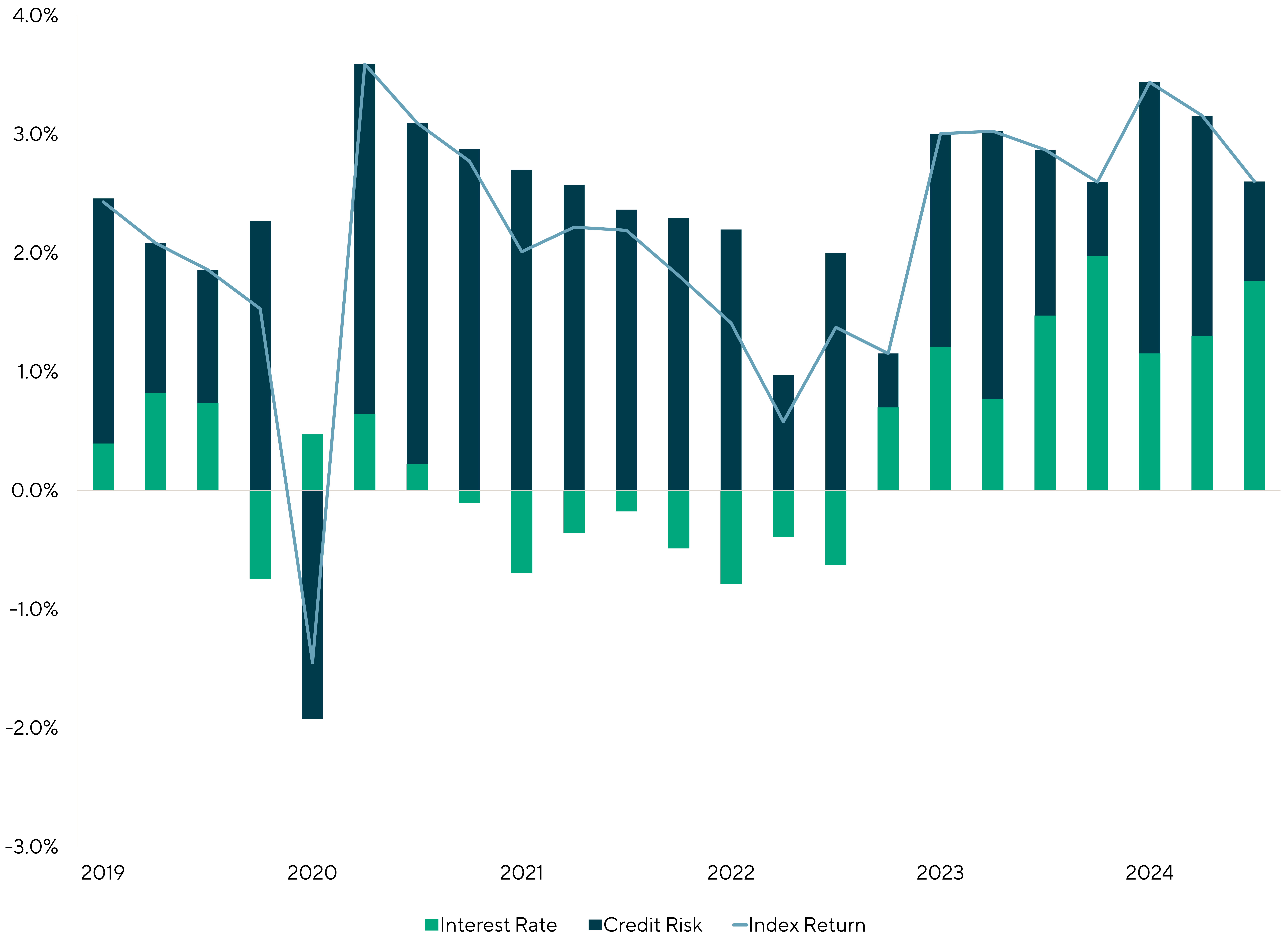- In addition, we provide additional descriptive statistics including: 1. The impact of interest rates (base rates) and credit changes (spread) on total return; 2. Decomposition of yields into implied spreads, base rates and floor rates.