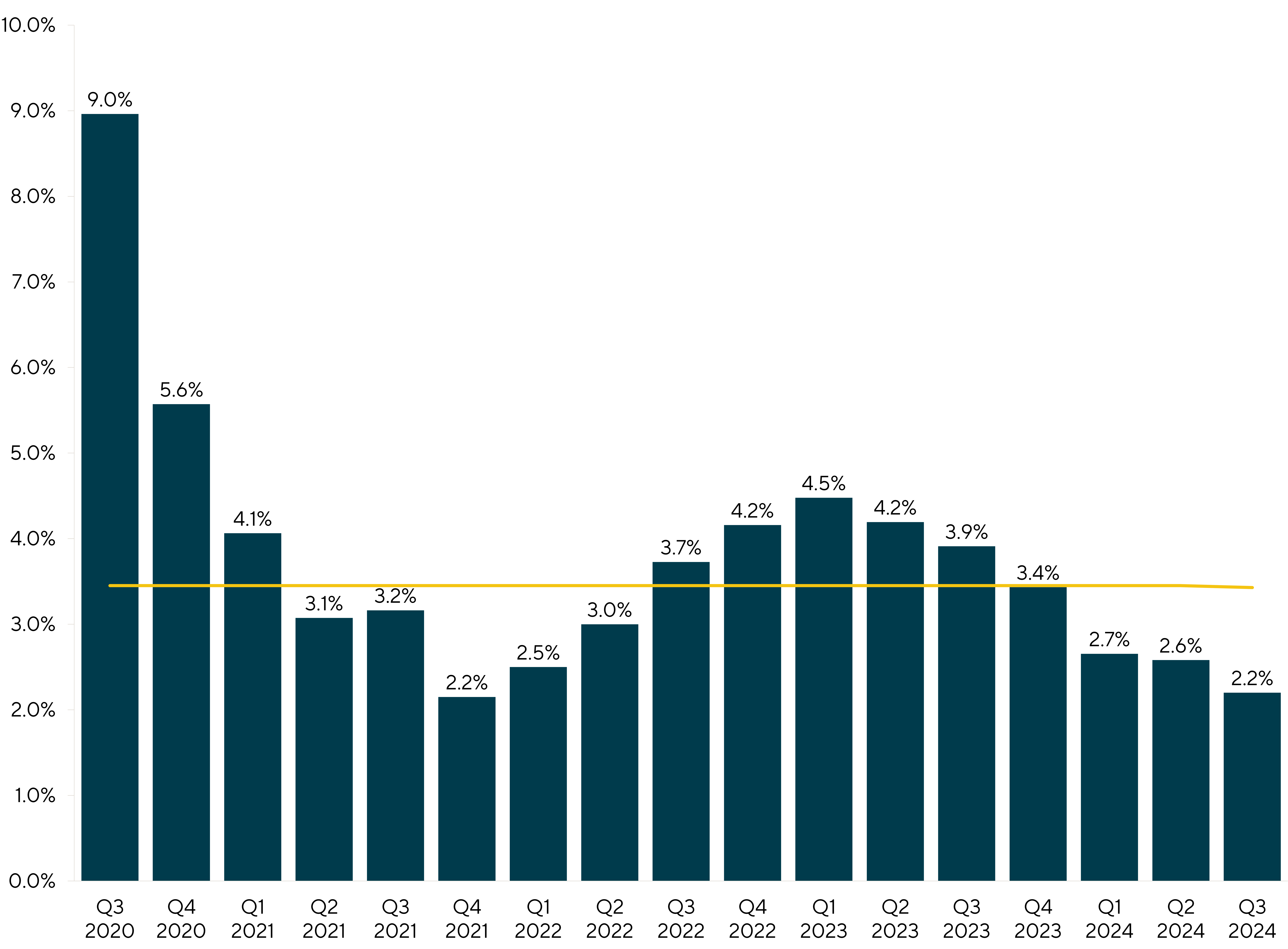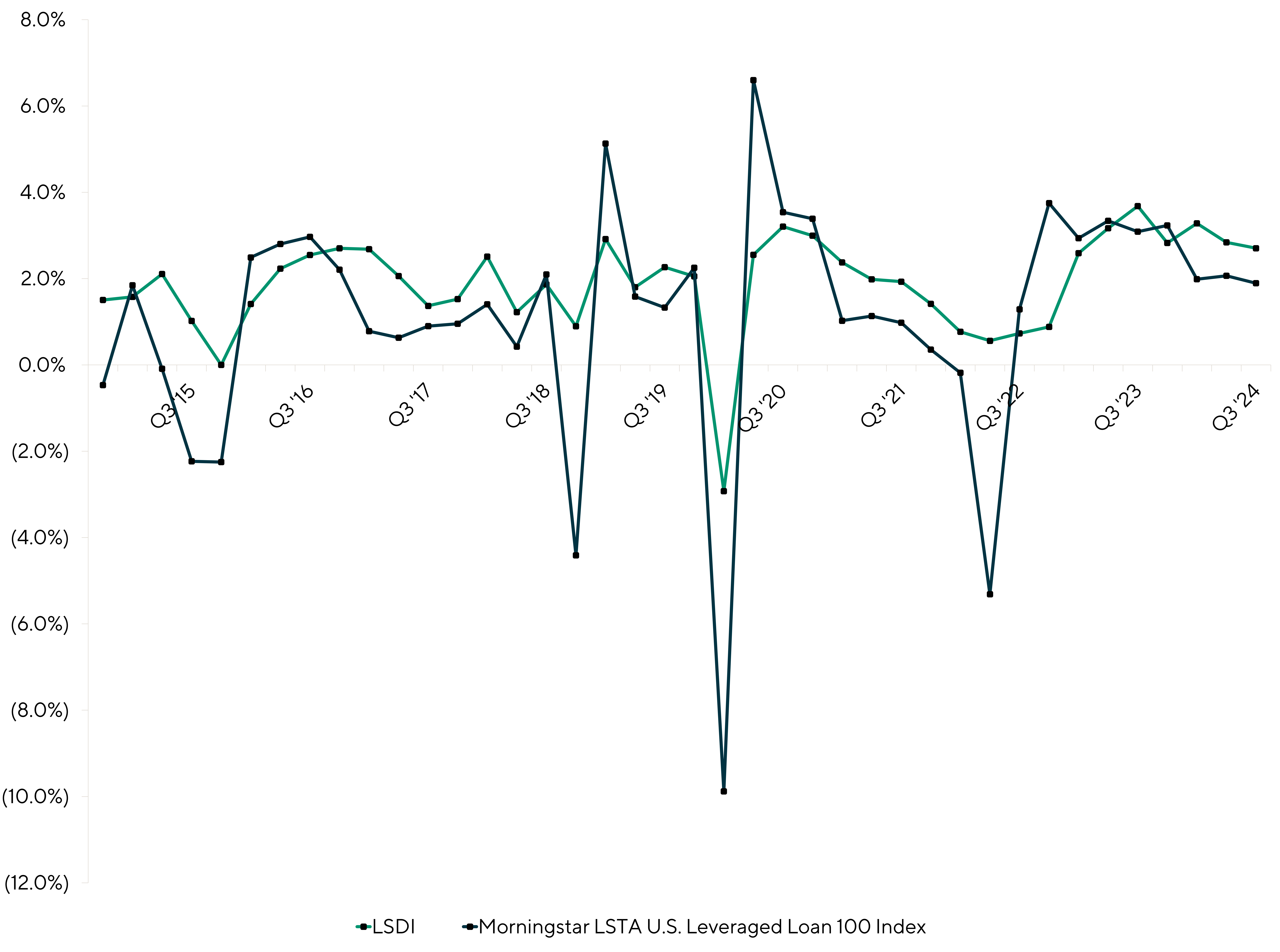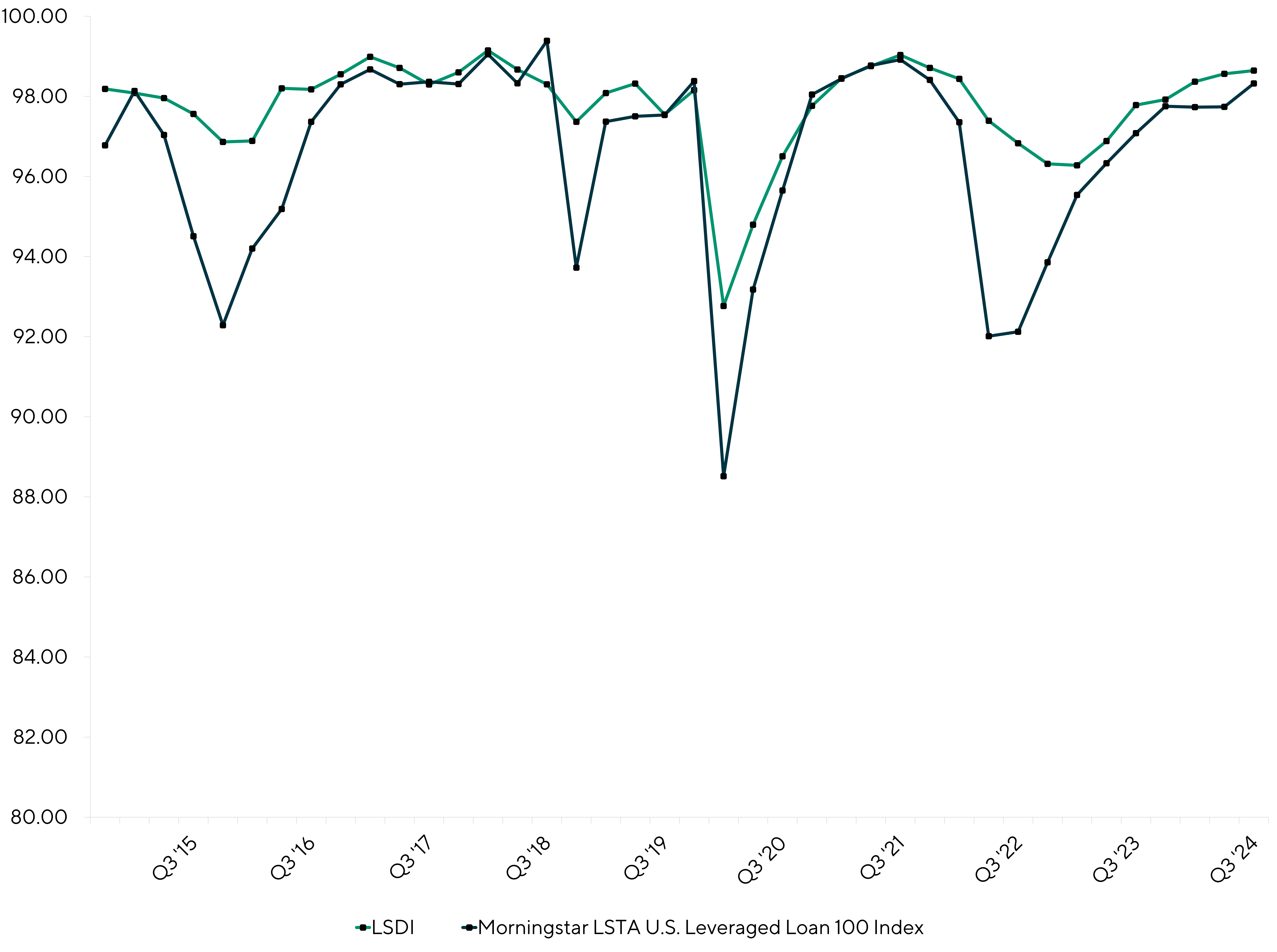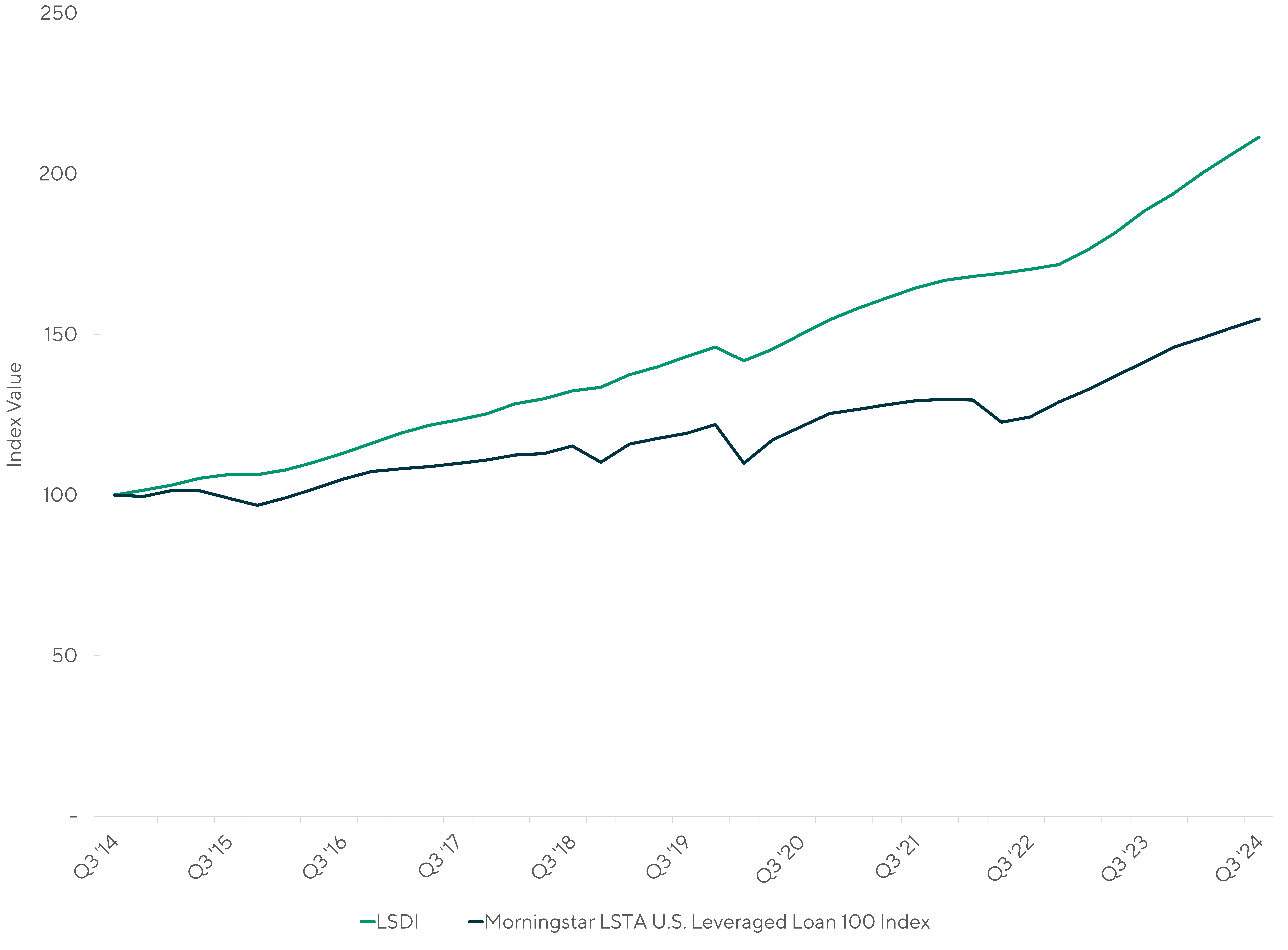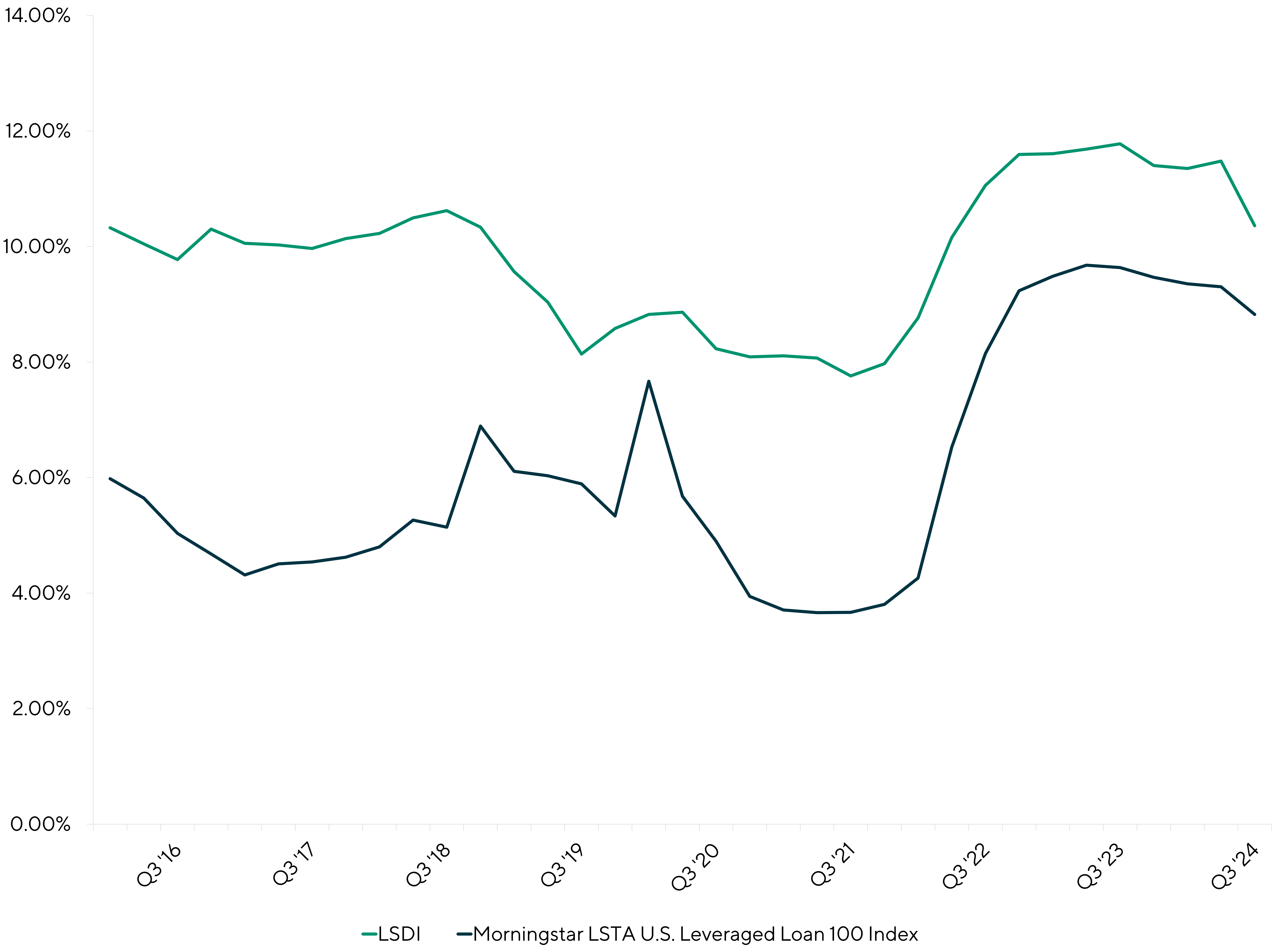 The results of the LSDI in the third quarter of 2024 were consistent with the trends and observations experienced over the prior 18 months. The LSDI yielded 10.4%, reflecting a 1.12% decline relative to the prior quarter as SOFR rates and spreads fell. As the competition to deploy capital has persisted in the market and SOFR rates have started to decline, returns in the BSL and direct lending markets both declined in Q3 2024. However, as a result of the competitive tailwinds and resilient portfolio company performance, the average fair value of loans in the LSDI increased marginally in the third quarter from 98.56% to 98.64%. Similarly, covenant defaults continued to decrease in the third quarter to 2.2%, which matches Q4 2021 for the lowest level of defaults dating back to Q2 2018.