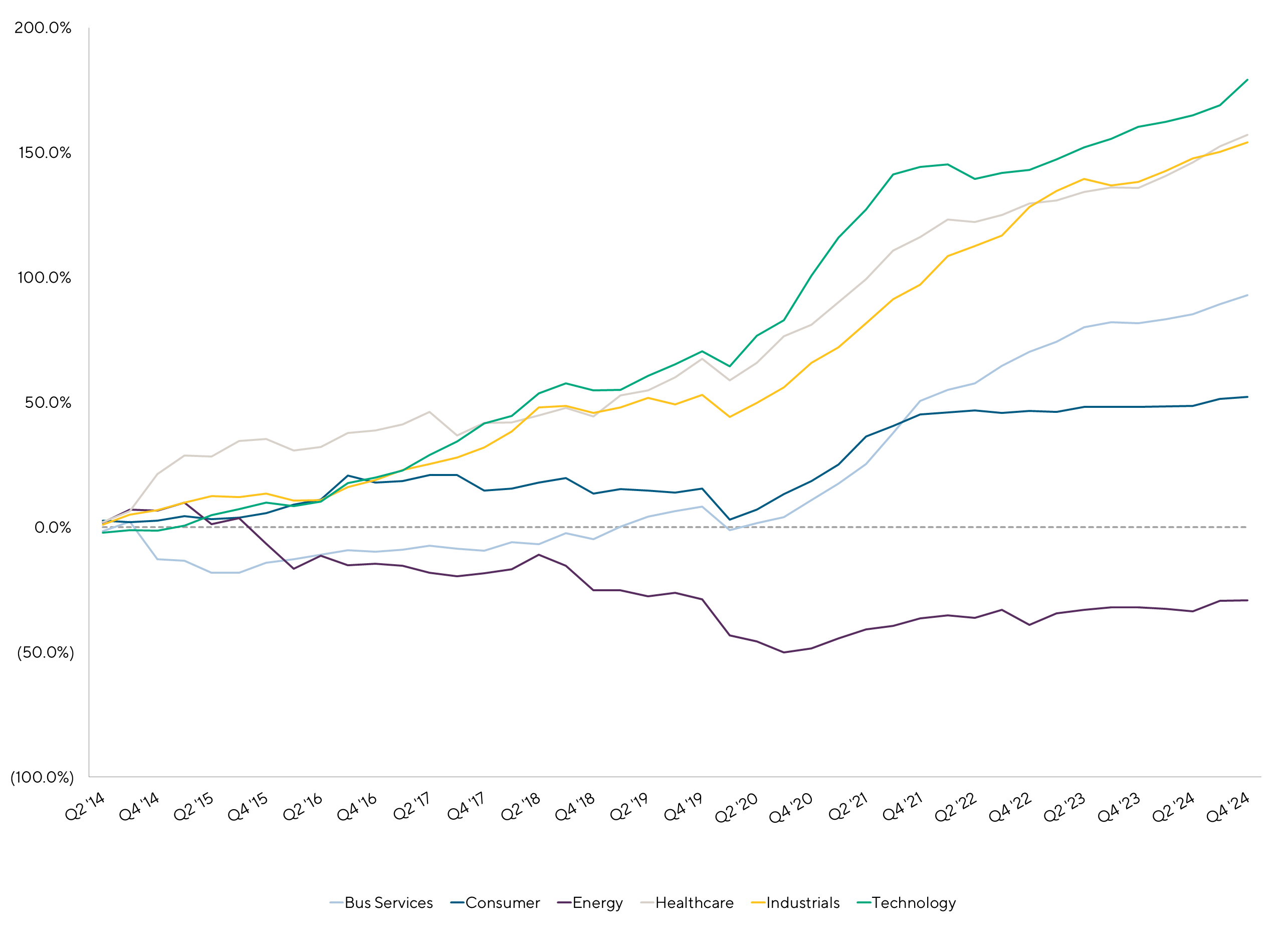 While all size categories saw improved fundamental performance, larger companies (i.e. companies with EBITDA > $50 million) grew the most in Q4 2024 as they exhibited more stable earnings and multiples. Smaller companies (i.e. those with EBITDA < $20 million) experienced the highest earnings growth; however, multiples contracted the largest amount of the three sub-indices. Investors continue to remain focused on larger and higher-quality companies while smaller companies tend to have less diverse product and service offerings with higher customer or supplier concentration and therefore less stable earnings and higher risk.