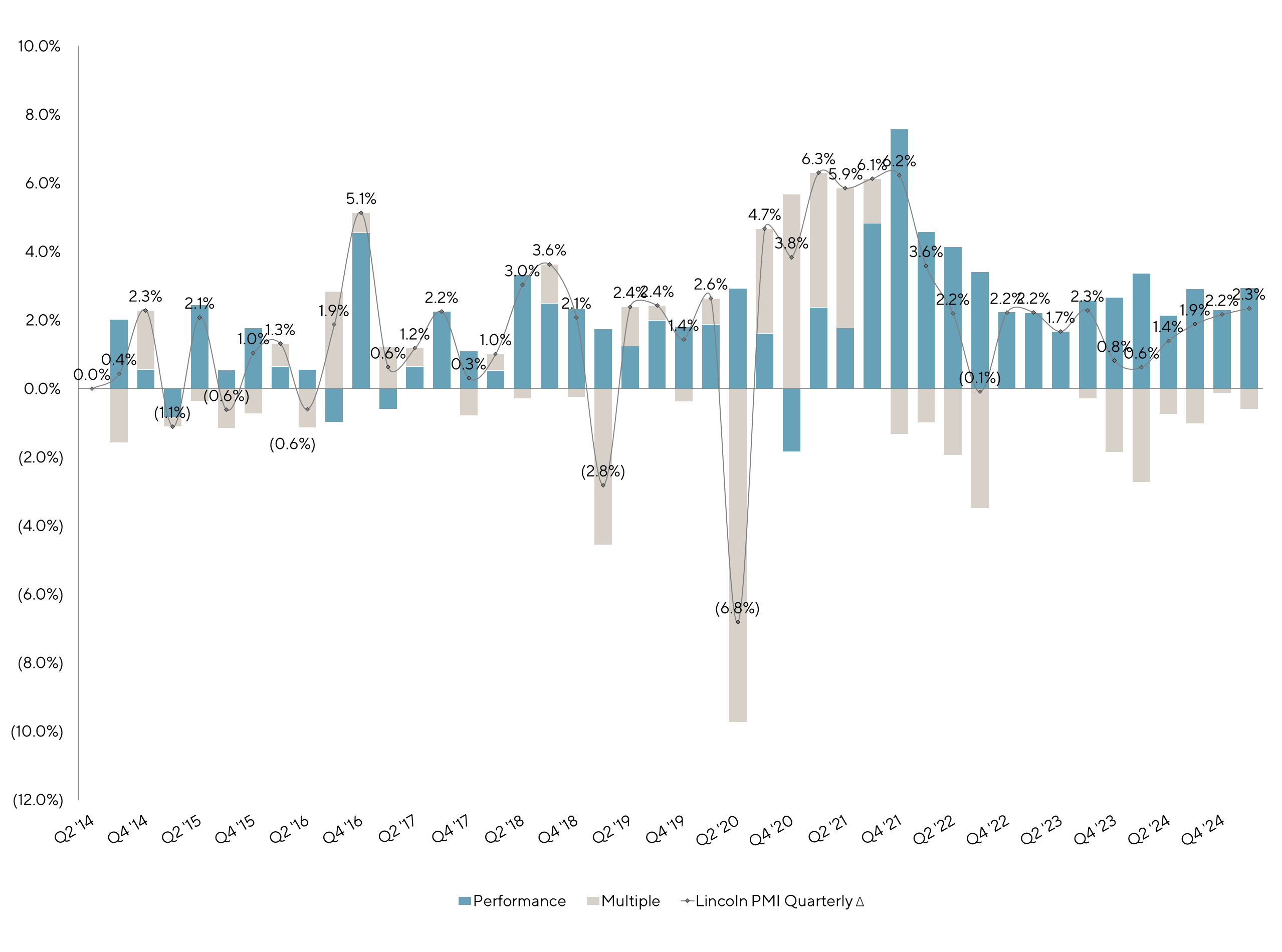 - Since its inception in Q1 2014, the Lincoln PMI has shown that private company enterprise value multiples have been less volatile than public company multiples and that earnings are the primary factor driving long term value creation.
